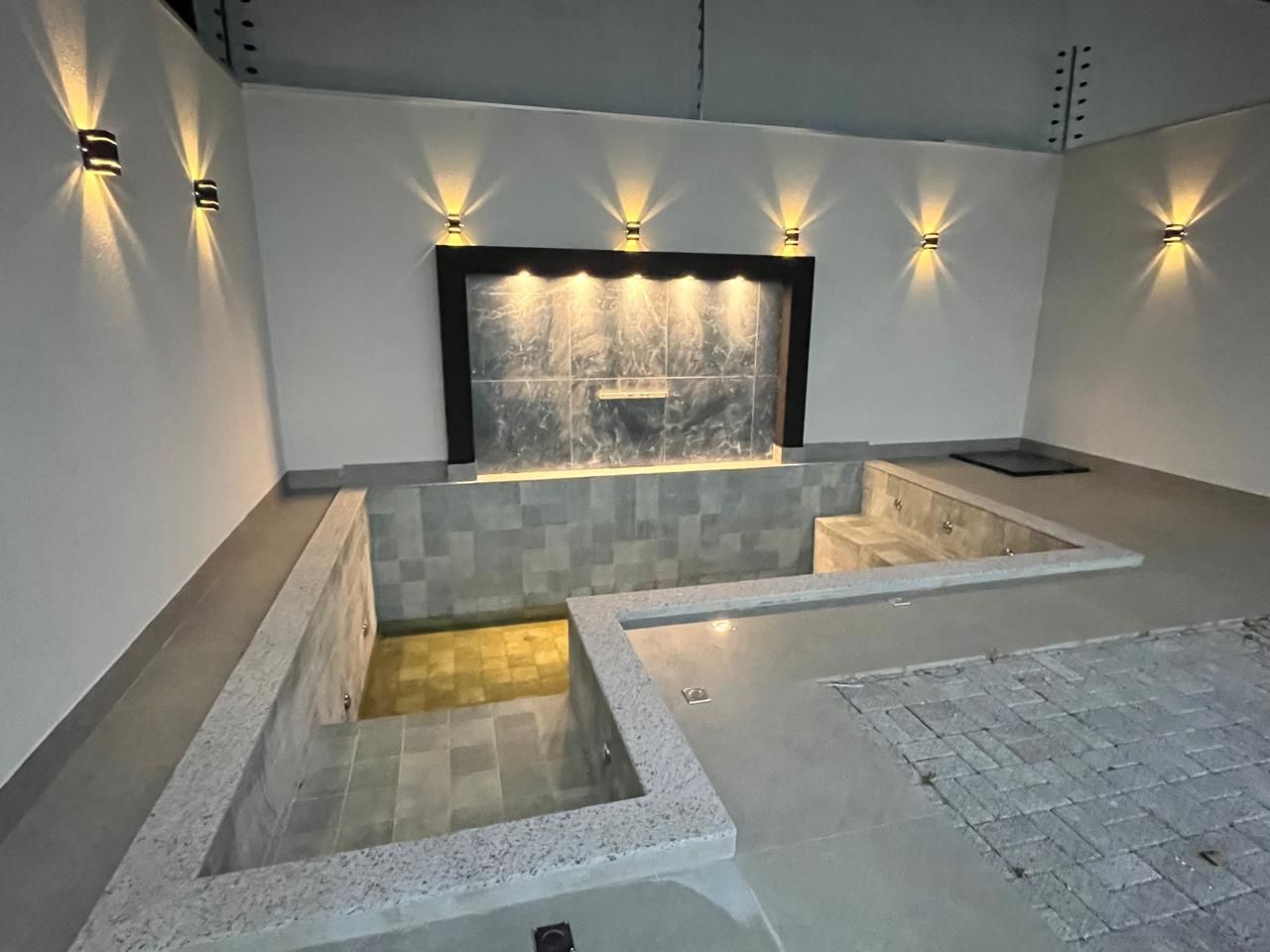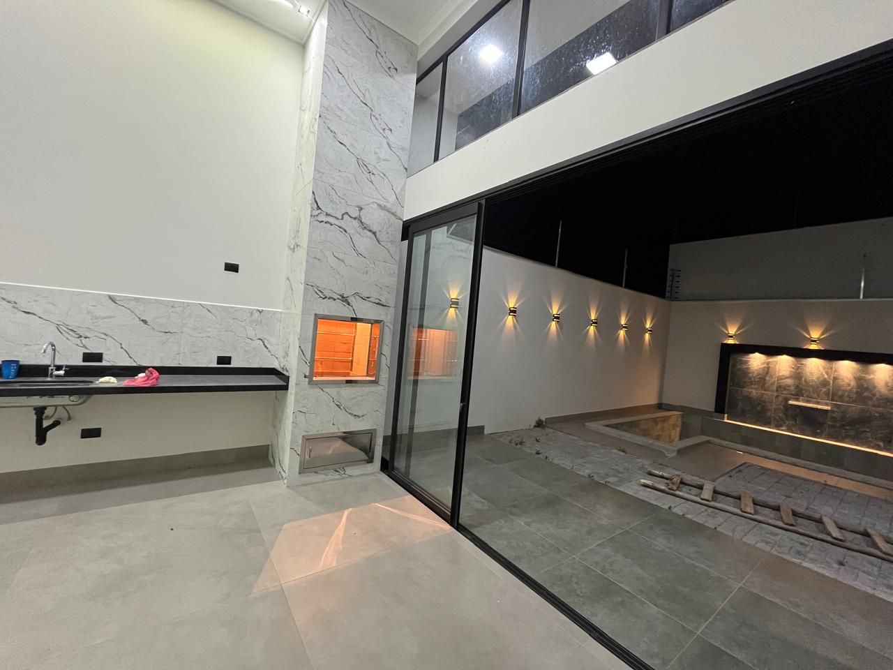 Um espaço delicioso na área gourmet, com piscina com cascata e Led, bicos de hidromassagem